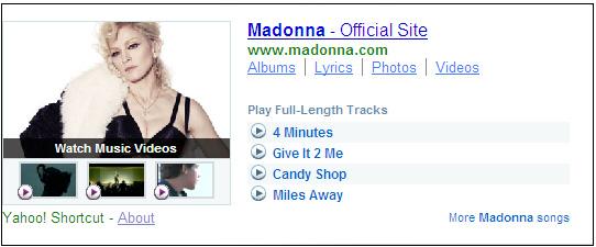 O Yahoo! anunciou hoje uma interessante parceria com site Rhapsody que permite aos usuários do Yahoo! Search ouvir faixas de músicas completas através dos famosos atalhos integrados aos resultados de buscas.