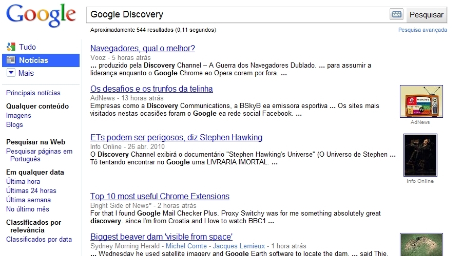- Também permite que se filtre apenas por notícias em português, além do período, da mesma forma que ocorre nos Vídeos.