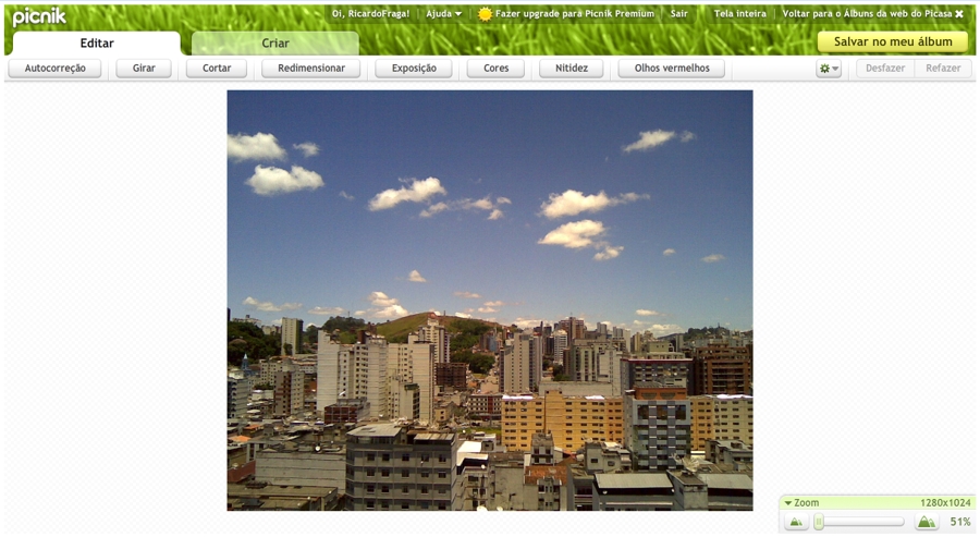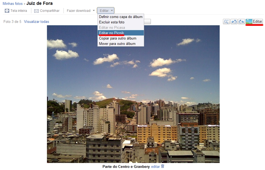 Agora, ao acessar qualquer imagem hospedada no Picasa Web, uma nova opção Editar no Picnik pode ser visualizada no meu Editar. Além desta opção, no canto direito, ao lado da opções de rotacionar a imagem, também foi adicionada uma opção para se editar a imagem com os recursos do Picnik.