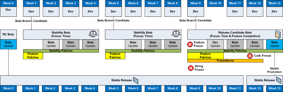 O Mozilla Firefox, por exemplo, teve sua segunda versão estável lançada após 1 ano de lançamento da primeira. A terceira versão demorou ainda mais, isto é, quase 2 anos para ser lançada. E assim por diante, seu ciclo de versões estáveis vinha durando aproximadamente 12 meses, até que a gigante das buscas entrou na guerra com seu navegador e a Mozilla teve de revisar seu planejamento.