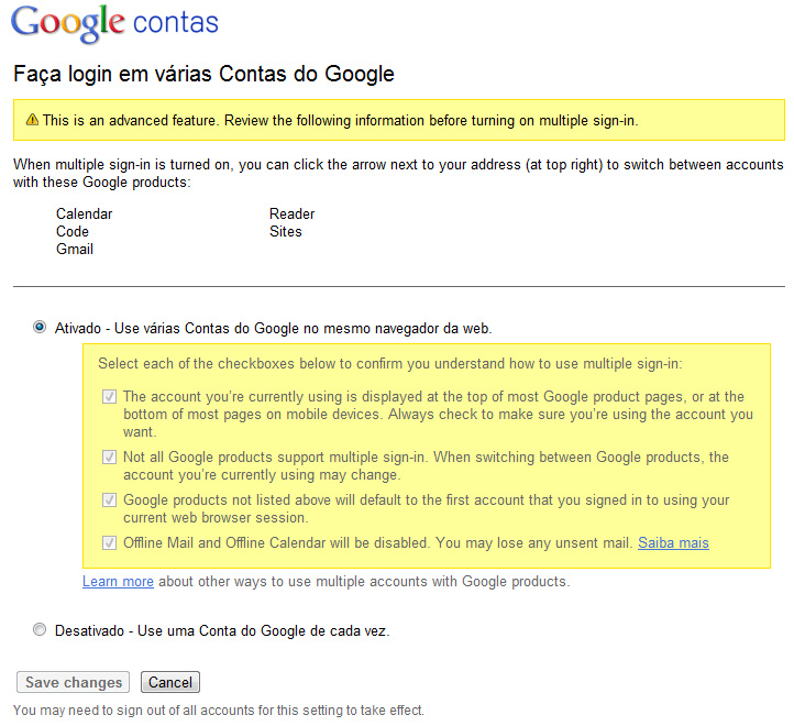 Se por algum motivo o usuário quiser desativar a nova funcionalidade, deve acessar a Conta Google em https://www.google.com/accounts/ e clicar em Alterar na opção Multiple sign-in.