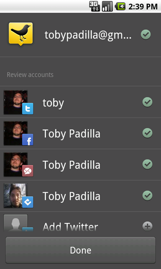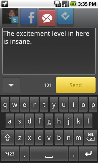 O TweetDeck for Android possui, inicialmente, apenas duas colunas. Na Home, as atualizações das quatro redes suportadas são listadas, separandas apenas pela cor: preto para Twitter, azul escuro para Facebook, azul claro para Foursquare e vermelho escuro (está mais para vinho) para o Google Buzz. Já na coluna Me, todas as atualizações feitas pelo usuário são listadas, independente da rede onde foi feita.