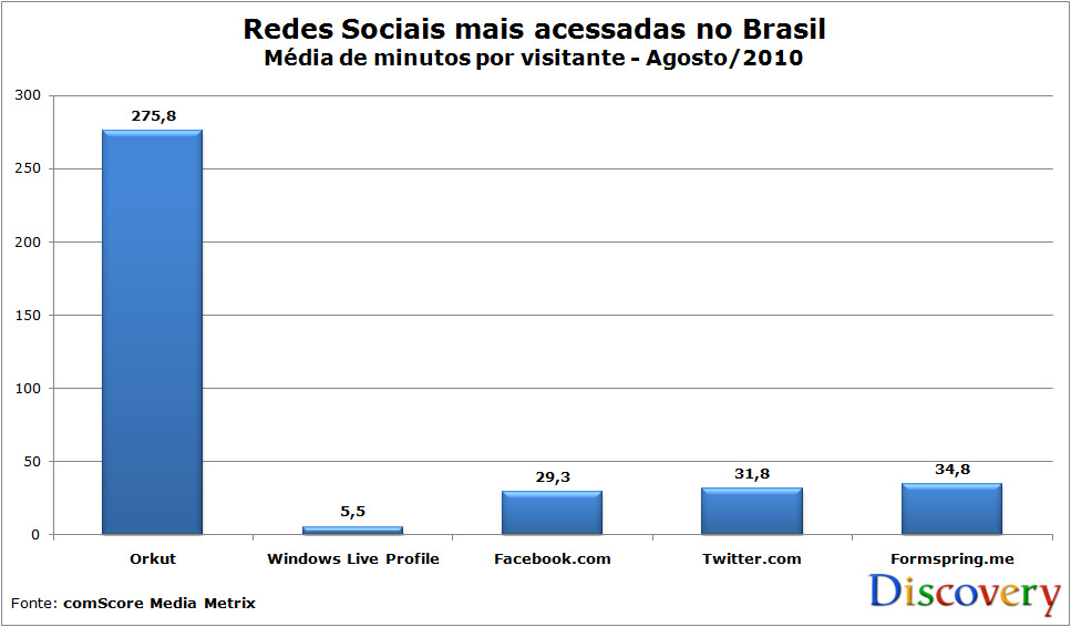 Se o número de usuários únicos do Orkut já impressiona, o tempo que eles dedicam à rede social do Google segue a mesma linha. Com uma média aproximada de 4,6 horas de utilização por mês, o Orkut lidera com uma folga espantosa. Para se ter uma idéia, o segundo colocado em tempo de utilização é o Formspring, no qual seus usuários gastam 34,8 minutos por mês. Atrás dele temos o Twitter, com 31,8 minutos, seguido pelo Facebook, com 29,3, e, finalmente, o Windows Live Profile, com 5,5 minutos. Acredito que a diferença brutal entre o número de visitantes únicos e o tempo gasto por eles no WLP tenha impressionado não somente a mim, mas a vocês também.