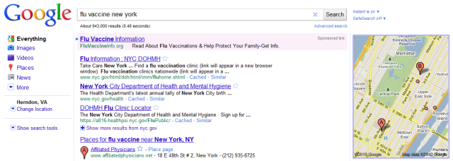 Ao procurar por termos relacionados a gripe, a informação aparecerá no topo dos resultados de pesquisas, incluindo dicas do site governamental flu.gov e uma caixa com um mapa onde mostra os locais onde a vacina ficará disponível.