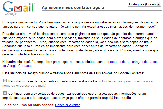 “Ei, espere um segundo. Você tem mesmo certeza que deseja importar as suas informações de contato e amigos para um serviço que no futuro não vai lhe permitir exportar essas informações do mesmo modo? Para deixar claro: você foi direcionado para essa página por um site que não permite do mesma maneira que você exporte seus dados para outros serviços, travando os seus dados de contatos e amigos que na verdade lhe pertencem. Então, quando você importar os dados lá, você não mais será capaz de tirá-lo. Achamos que isso é uma coisa importante para você saber antes de importar os dados. Apesar de discordarmos veementemente desse protecionismo de dados, a escolha é sua. Porque, afinal, é você quem deve ter controle sobre seus dados.”