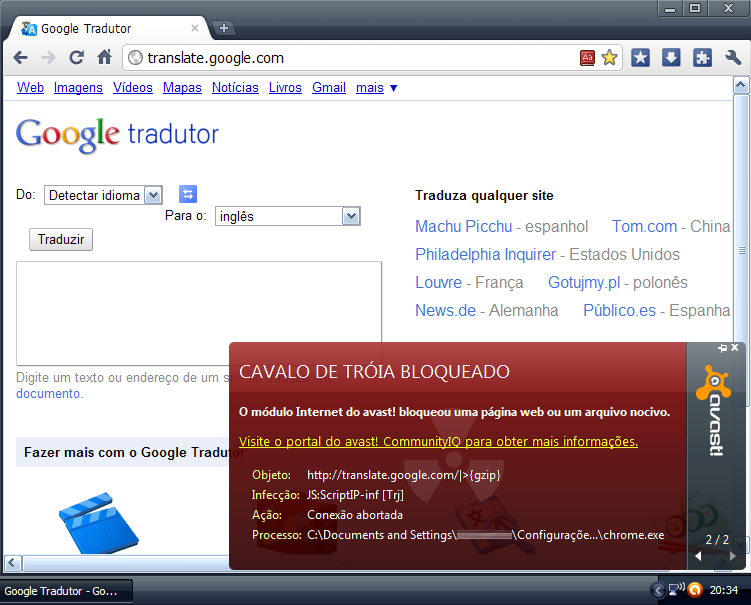 Classificado como JS:ScriptIP-inf [Trj], a suposta ameaça é identificada e bloqueada pelo Avast assim que o endereço translate.google.com, cujo carregamento é automaticamente suspenso. Segundo alguns relatos, forçando o carregamento via F5, a página chega a ser exibida, inclusive permitindo que traduções sejam feitas.