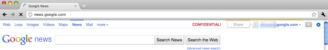 “Como você pode ver, é uma barra de ferramentas que existe no topo das propriedades do Google – neste caso, o Google News. Há um botão Share, um lugar para um ícone de conta do Google, e um nome de usuário do Google. Próximo a ele tem uma contagem numérica – não está claro o que isto ainda. (Talvez um número de ações?) E ao lado um menu de opções” diz o blog.