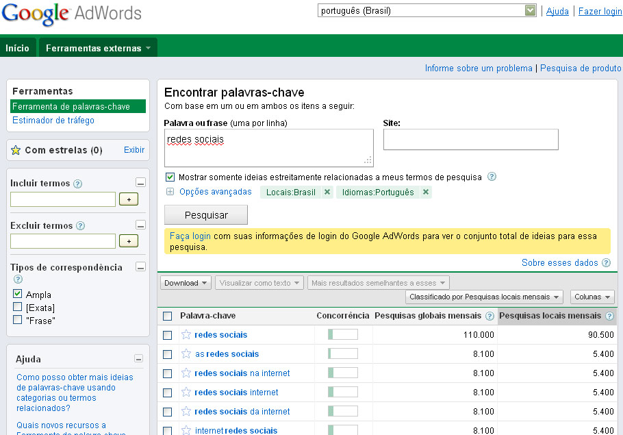 Dica: marcando a opção “” logo abaixo da caixa de palavras-chave, você terá somente resultados referentes ao termos que você digitou, assim não aparecem palavras-chave que não sejam relacionadas com o seu conteúdo. - Em opções avançadas, selecione Brasil – Português caso essas opções não estejam marcadas