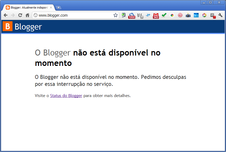 Mas, ao que tudo indica, algo não saiu como previsto. Ao longo do dia, centenas de usuários relataram dificuldade ou impossibilidade para acessar os seus blogs. No início da noite de hoje, contudo, a situação piorou. Além do endereço blogger.com ficar inacessível, todos os blogs hospedados no serviço saíram do ar. Fazendo uma rápida pesquisa no Twitter, foi fácil notar a extensão do problema. Usuários de várias nacionalidades relataram que seus blogs estavam fora do ar.