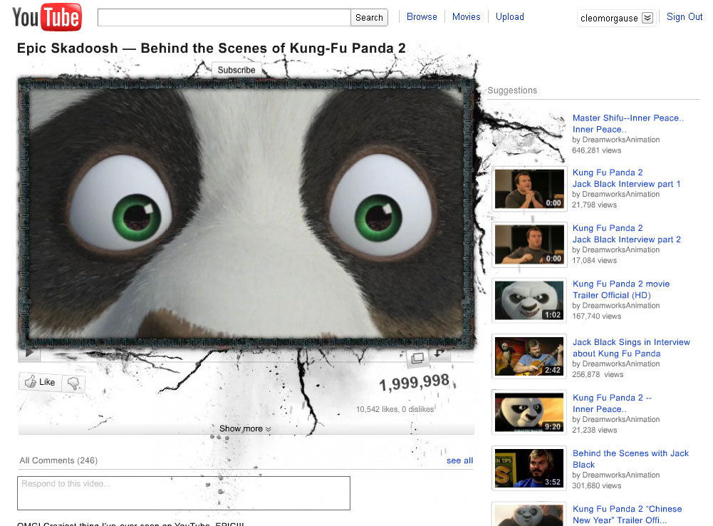 Depois da animação do Kung Fu Panda, arraste os avatares dos filmes na lista lateral para dentro do vídeo. Um deles muda para o trailer do filme em uma nova tela onde cada parte dela possui uma ação diferente. Aaaah, clica no vídeo ai em cima que você vai ver do que estou falando.