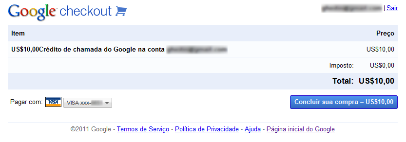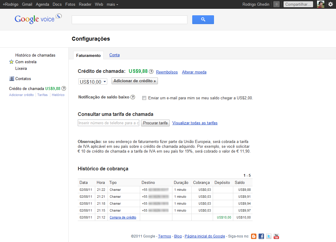 Pense nas ligações dentro do Gmail como o SkypeOut: o usuário compra créditos para realizar ligações. A compra de crédito se dá no dashboard do Voice, com valor mínimo de US$ 10. A transação é rápida, feita através do Google Checkout. Se você já comprou alguma coisa no Android Market, por exemplo, não precisa configurar nada, basta confirmar a compra.