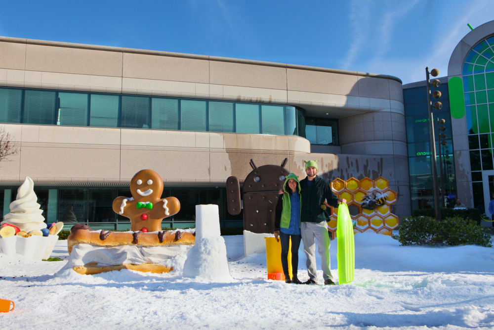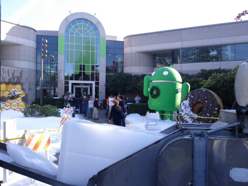“Parece que o homem do tempo deixou passar uma nevasca em Mountain View hoje”, disse em modo irõnico o perfil oficial do Android no Twitter e em sua página no Google+. Veja, abaixo, como ficou o campus do Google com a neve artificial.