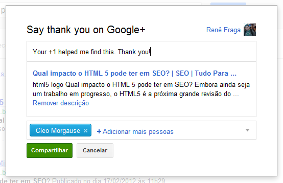 O Google lançou um pequeno recurso em seus resultados de pesquisa (na versão americana do buscador) que permite agradecer amigos e conhecidos pela indicação feita através do botão Google +1.