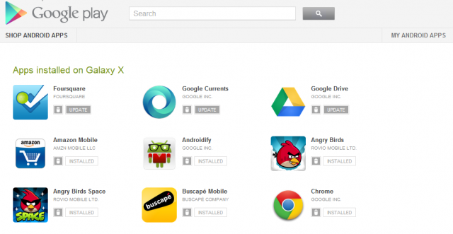 Disponível na página ‘My Android Apps’, você poderá verificar um botão de atualização ou lixeira para excluir aplicativos.