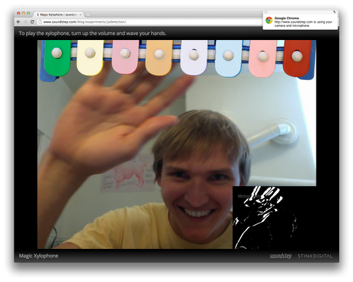 “A API getUserMedia também permite que sites possam criar novas experiências que antes não eram possíveis no navegador. Por exemplo, Romuald Quantin e Magnus Dahlstrand, da Stinkdigital, criaram um xilofone mágico que você pode tocar apenas acenando com as mãos em frente da câmera”.