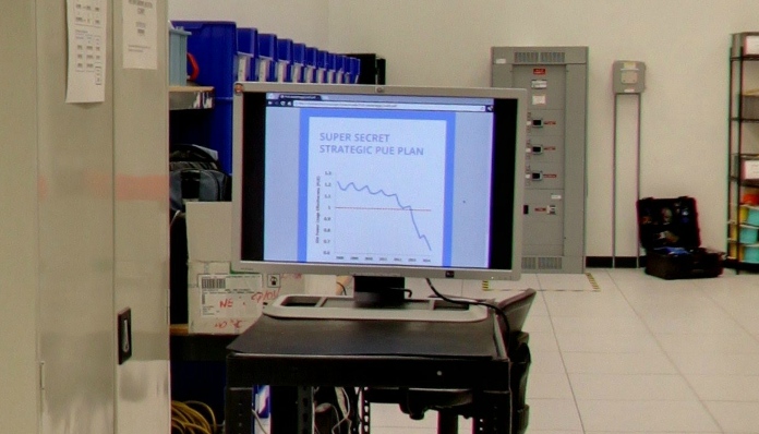 Em outro ponto do data center de Lenoir, na Carolina do Norte, um computador exibe a mensagem de um suposto “super plano secreto”.
