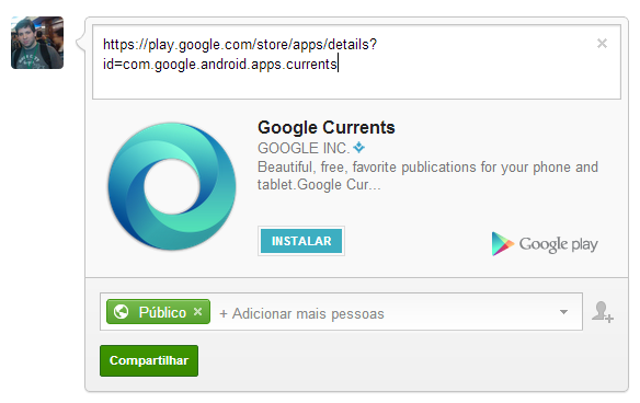 Para utilizar o recurso, basta colar a URL do aplicativo que você deseja compartilhar e o Google+ irá incorporar o botão de instalação automaticamente.