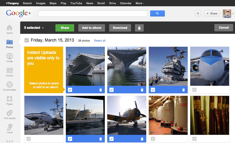 Agora é possível fazer o download de suas fotos no Instant Upload do Google+ Photos. Você pode selecionar as fotos que você deseja e clicar no botão download para baixar de forma instantânea.