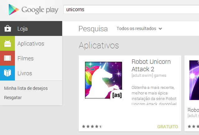 O Google Operating System descobriu um easter egg divertido no Google Play: basta acessar a página do produto e clicar no botão de pesquisa, sem digitar qualquer termo. A busca vai retornar resultados para unicórnios (“unicorns”).