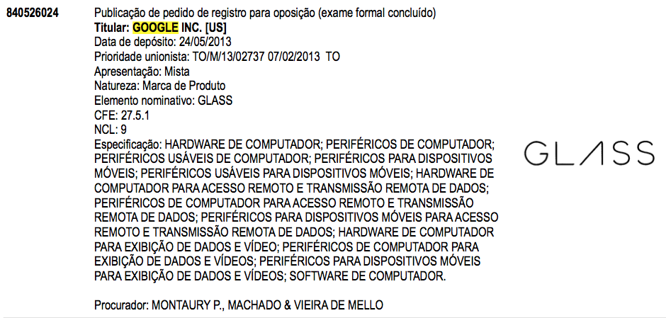 O relatório, publicado pelo Instituto Nacional da Propriedade Industrial (INPI), mostra que o buscador procurou registrar seu dispositivo no início do ano e especifica que o Google Glass como um produto de hardware, periférico de computador, computador com acesso remoto e transmissão remota de dados, além de outros atributos.