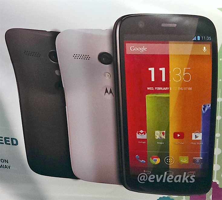 O novo dispositivo da Motorola teria uma tela de 4.5 polegadas com resolução 720p, processador Qualcomm Snapdragon S4 Pro (1.2GHz), câmera traseira de 5 MP (1.3 MP na frente), bateria de 1,950mAh, armazenamento interno de 8GB e equipado com Android 4.3 Jelly Bean.