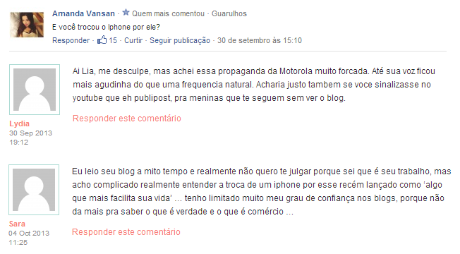 Nos comentários abaixo, retirados do blog Just Lia, algumas leitoras questionaram a autora sobre uma suposta mudança em suas preferências e a falta de uma fácil indicação de que o conteúdo foi patrocinado.