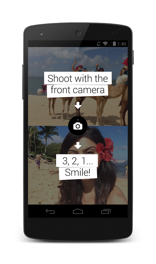 “Tire uma foto com a câmera frontal e outra com a câmara traseira e compartilhe ambas numa só imagem. Demora um segundo, é divertido e é gratuito”, diz os autores do programa.