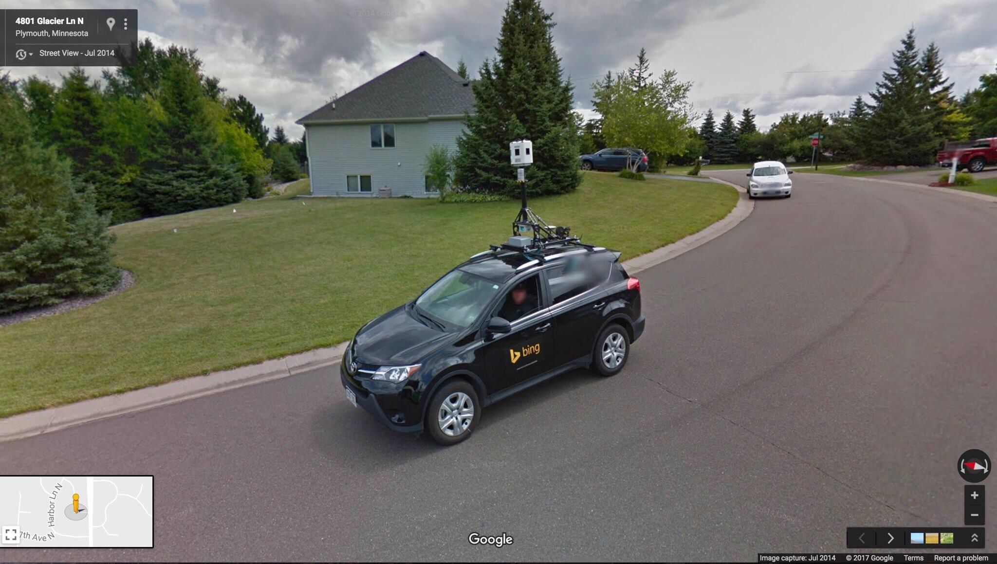 Enquanto o motorista do Bing foi capturado olhando para o Street View, a pessoa responsável pelo mapeamento do Google acena para o competidor.