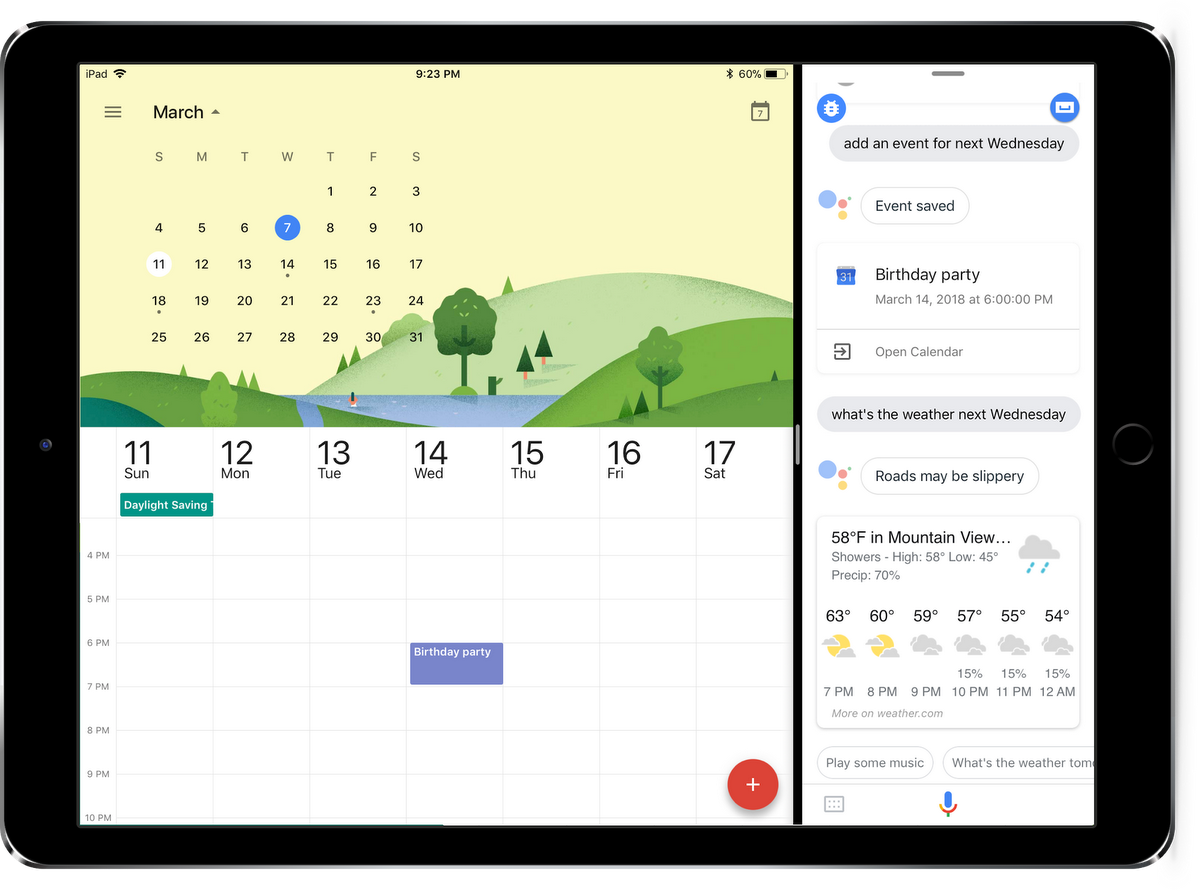 Além disso, é possível usar a função multitarefa do iPad com iOS 11, para conversar com o Assistente enquanto você planeja uma viagem ou checa o calendário.