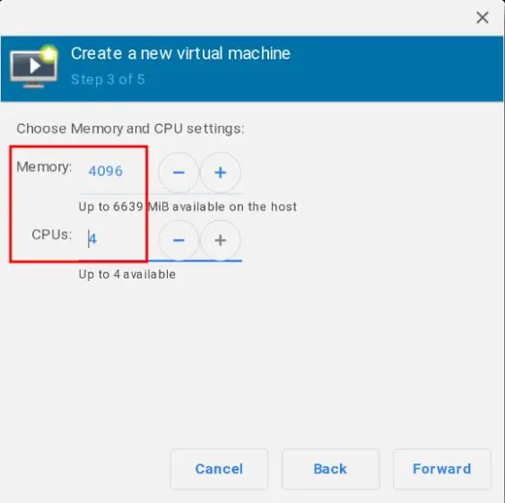 7. Aqui, insira quanta memória e núcleos de CPU você deseja alocar para a máquina virtual do Windows. Eu recomendaria pelo menos 4 GB de RAM e 4 núcleos se você estiver instalando o Windows 10. Para o Windows 7, 2 GB de RAM e 2 núcleos fariam o trabalho. Mas, novamente, quanto mais melhor.