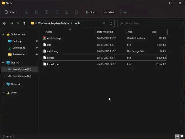 2. Agora, vá para a pasta WindowsSubsystemAndroid na unidade C: e abra Ferramentas. Aqui, renomeie o arquivo do kernel para kernel_roote kernel_bak para kernel. Você terminou.