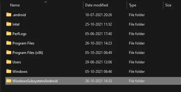 3. Em seguida, abra a unidade C: e crie uma pasta com o nome WindowsSubsystemAndroid(sem espaços).