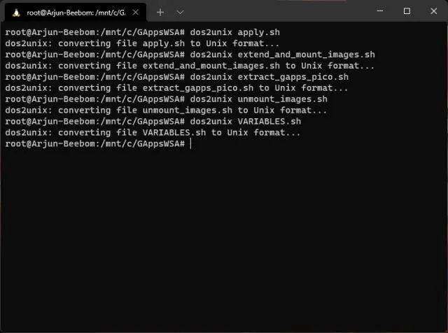 4. Quando estiver na pasta GAppsWSA, execute os comandos abaixo um por um.