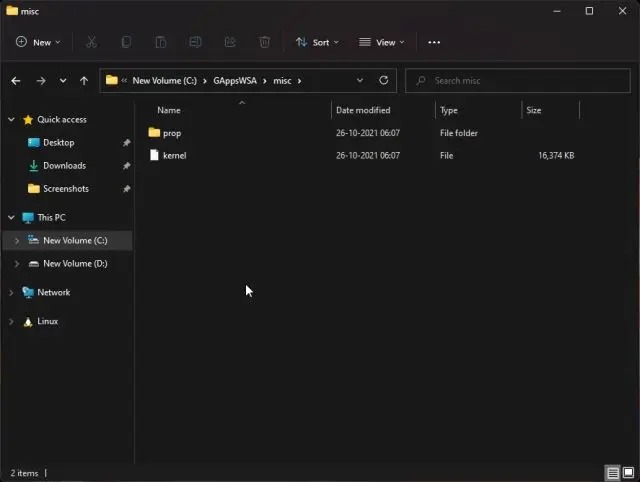 8. Novamente, volte para a pasta GAppsWSA e vá para a pasta misc. Aqui, copie o arquivo “kernel” .