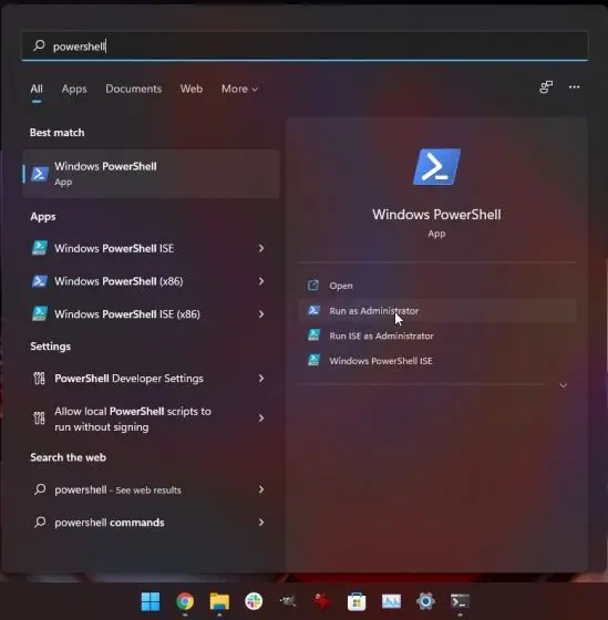 1. Pressione a tecla Windows, procure PowerShell no Menu Iniciar e clique em “Executar como administrador” para abri-lo.