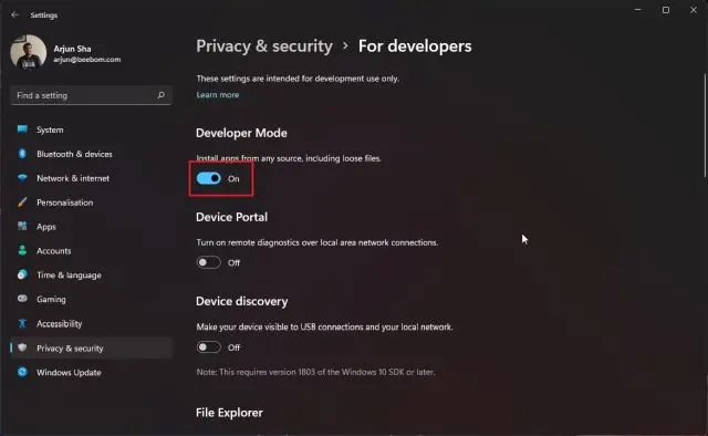 3. Se você receber algum erro, terá que habilitar o modo de desenvolvedor no Windows 11 para corrigir o problema. Abra as Configurações do Windows -> Privacidade e segurança -> Para desenvolvedores . Aqui, ative a alternância “Instalar aplicativos de qualquer fonte, incluindo arquivos soltos” no Modo de desenvolvedor. Agora, execute o comando acima e ele deve funcionar bem.