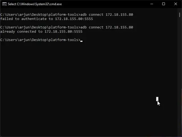 8. Depois de configurar o ADB, abra o Prompt de Comando na pasta platform-tools (digitando CMD na barra de endereços do Explorador de Arquivos) e execute o comando abaixo. Certifique-se de substituir “ipaddress” pelo que você anotou acima. Se você receber um erro com falha, execute o comando novamente e você será conectado desta vez.