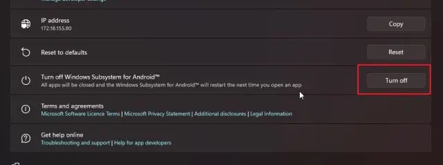 1. Feche todas as janelas e abra a página Configurações do WSA. Aqui, desative o Windows Subsystem for Android . Você deve esperar até que o sinal de carregamento desapareça.