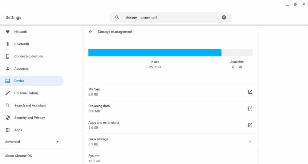 O Chromebook vem com menos capacidade de armazenamento no disco rígido em comparação com os laptops padrão. No entanto, o armazenamento de um Chromebook varia de modelo para modelo, mas geralmente o espaço no disco rígido de um Chromebook está entre 16 GB e 32 GB. Às vezes, esse espaço no disco rígido é menor que um smartphone. Pouco armazenamento no disco rígido é um dos motivos para deixar seu Chromebook mais lento.