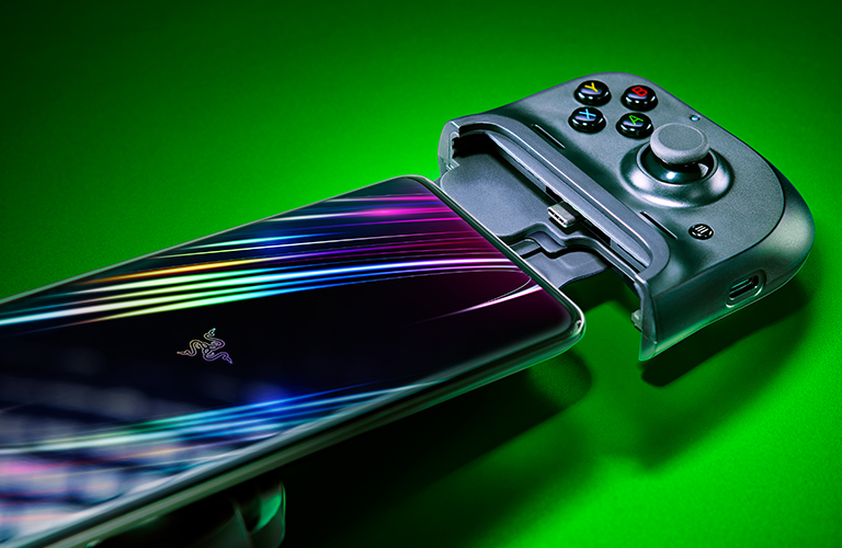 O controlador tem um espaçador no meio que se estende para prender o telefone e se conecta por Bluetooth.
