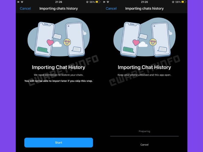 As capturas de tela compartilhadas pelo WABetaInfo sugerem que o aplicativo solicitará sua permissão antes de começar a migrar seu histórico de bate-papo.