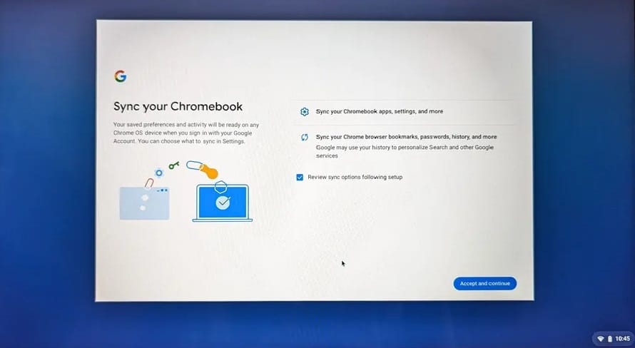 5. O próximo passo é sincronizar os dados da sua conta Google. Aqui você tem a opção de sincronizar as configurações do Chromebook, o histórico de navegação do Chrome e muito mais. No entanto, se você quiser impedir que qualquer coisa seja sincronizada na lista, marque a caixa ” Revisar opções de sincronização após a configuração” . Depois disso, clique no botão Aceitar e continuar .