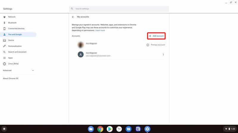 4. Você encontrará sua conta do Google adicionada com este Chromebook. Se você quiser adicionar mais uma conta do Google, clique no link + Adicionar conta .