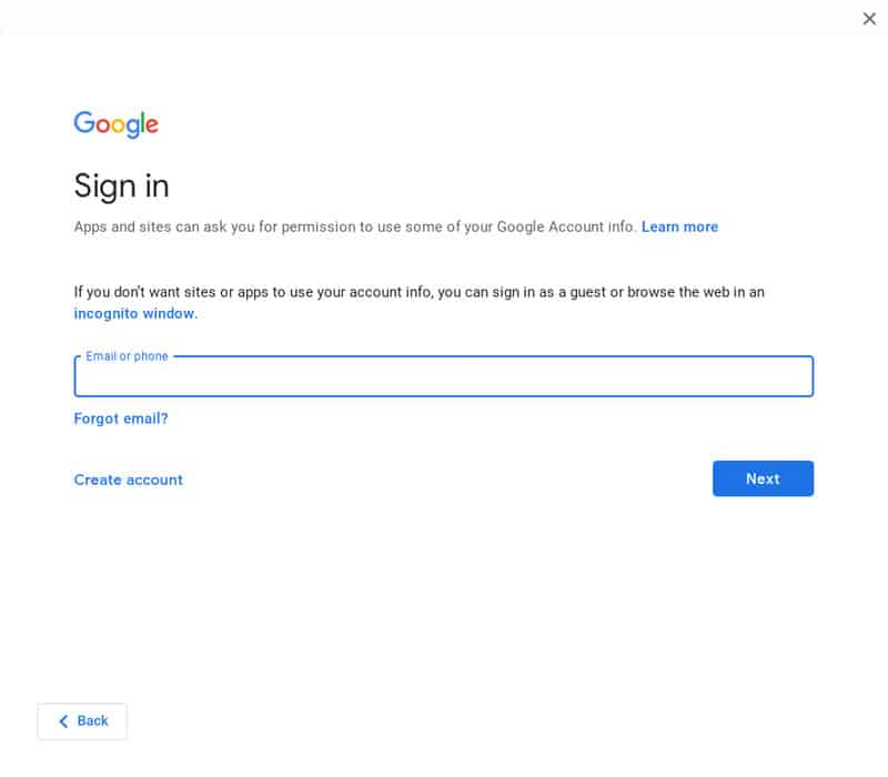 2. A janela “ Entrar no Chromebook” apareceu na tela onde você precisa inserir as credenciais da sua conta do Google. Então, vamos digitar seu endereço de e-mail e clicar no botão Avançar.