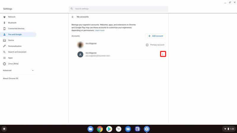8. Sua nova conta do Google foi adicionada com sucesso ao seu Chromebook. No entanto, se você precisar remover qualquer conta do Google do Chromebook, volte para a janela Minha conta da seção Você e o Google, onde todas as listas de contas do Google são fornecidas. Para remover qualquer conta do Google, clique nos três pontos ao lado da conta do Google específica que você deseja remover.