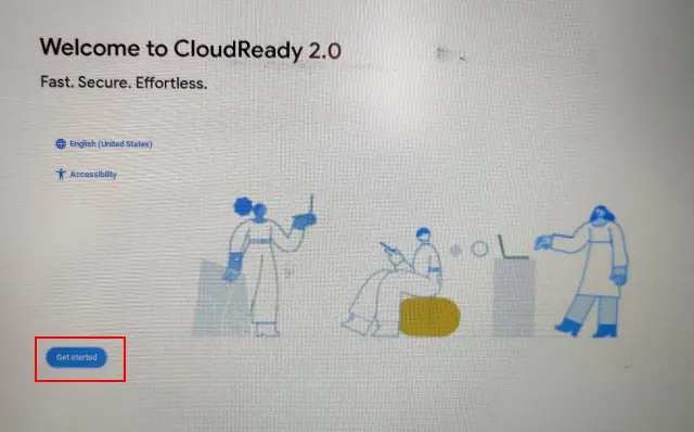 3. Agora, a tela “Bem-vindo ao CloudReady 2.0” aparecerá. Aqui, clique em “ Começar ”. Agora, siga as instruções na tela e faça login com sua conta do Google.