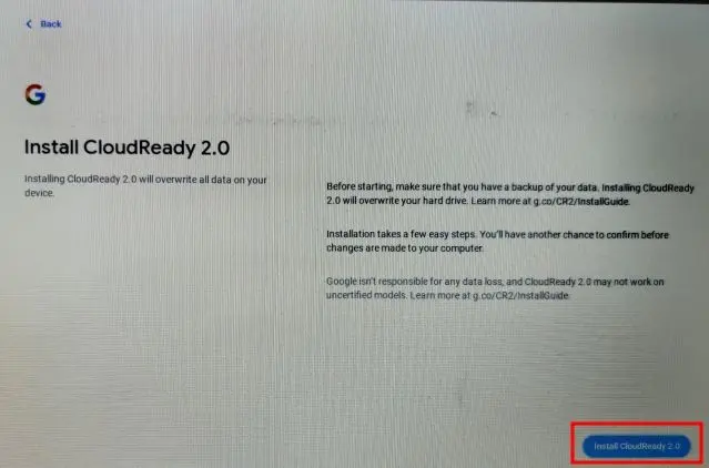 7. Por fim, clique em “ Instalar CloudReady 2.0 ” e depois clique em “Instalar” novamente. Observe que esta etapa limpará todo o disco rígido, portanto, faça um backup antes de executar esta ação. Quando a instalação estiver concluída, desligue o computador e remova a unidade USB.