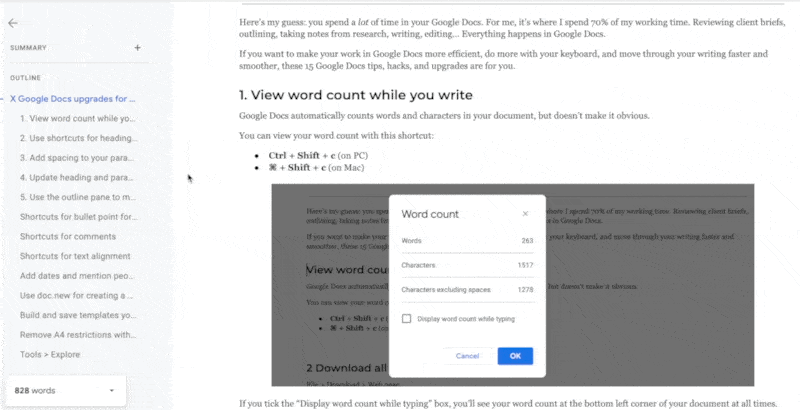 Se você marcar a caixa “Exibir contagem de palavras ao digitar”, verá a contagem de palavras no canto inferior esquerdo do documento o tempo todo. Lembre-se de que, se você atualizar ou fechar a guia com seu documento, a contagem de palavras não estará mais no canto e você terá que marcar essa caixa novamente.