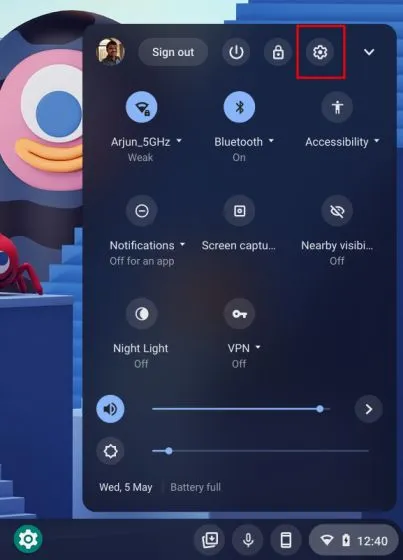 1. Primeiro, abra a página Configurações clicando no ícone da roda dentada no painel Configurações rápidas.