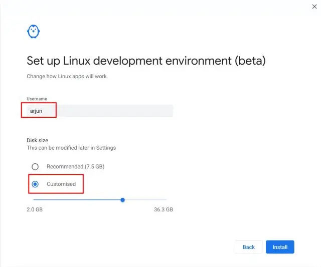 5. Na próxima página, digite seu nome de usuário desejado para Linux e selecione “Personalizado” para escolher quanto espaço em disco você deseja para Linux. Eu tenho armazenamento interno total de 64 GB, então atribuí 25 GB. Se você tem uma capacidade de armazenamento maior e quer jogar, desenvolver programas no Linux, deve estender ainda mais o armazenamento.